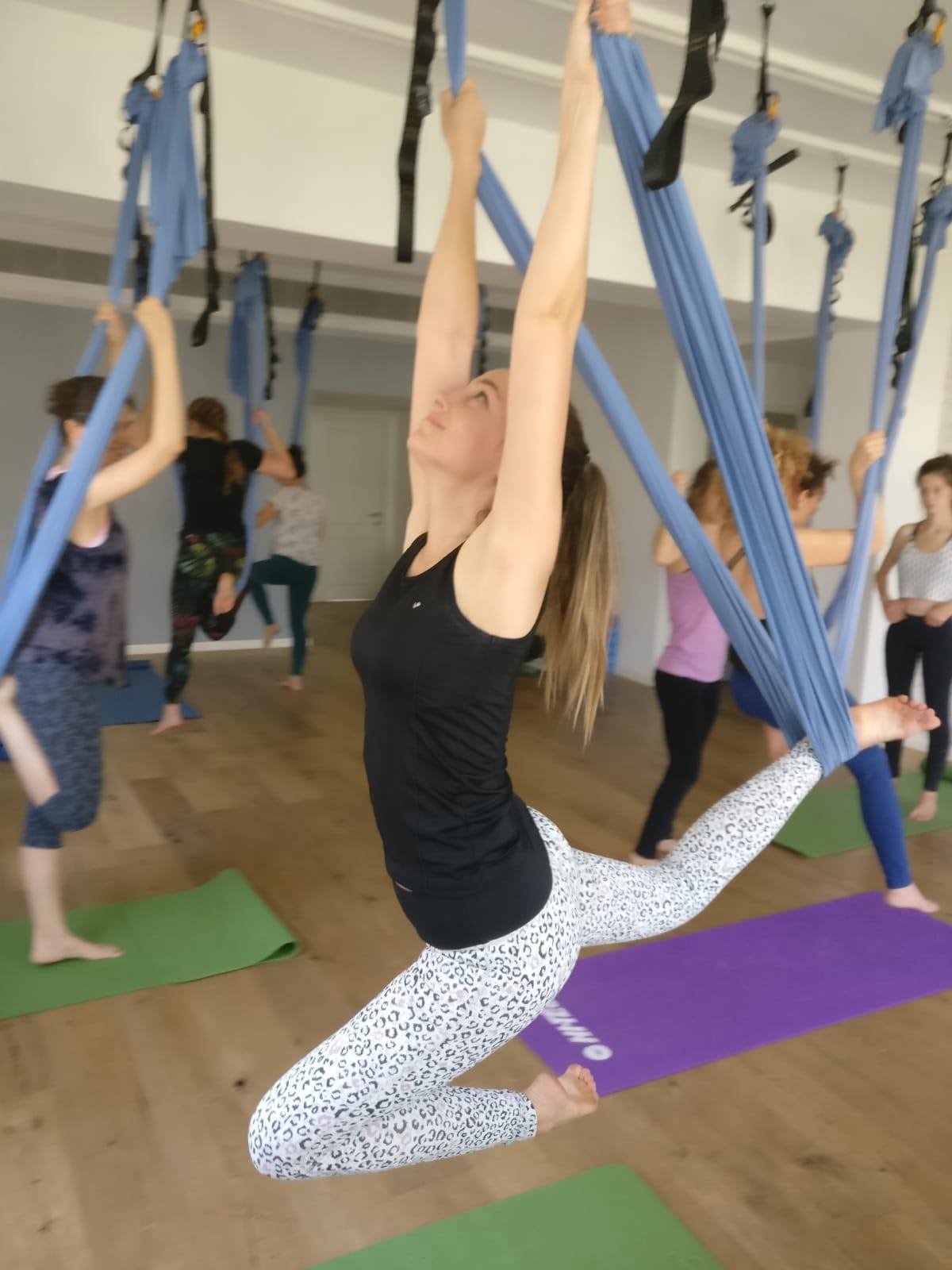 מתרגלת אהובה שביקשה להשאר בעילום שם: "החוויה הכי משמעותית שלי בתרגול יוגה אווירית היא האפשרות לראות את ההתקדמות תוך כדי העשייה. התרגילים המתקדמים נשענים על יסודות של תרגילים בסיסיים יותר ואפשר ממש להרגיש את ההתקדמות עם כל תרגיל כשעולים בו ברמת הקושי. תוך כמה שבועות בקבוצת המתקדמות שמתי לב שאני מצליחה לעשות ממש בקלות תרגילים שהיו נראים לי בלתי אפשריים כשרק התחלתי להתאמן עליהם".