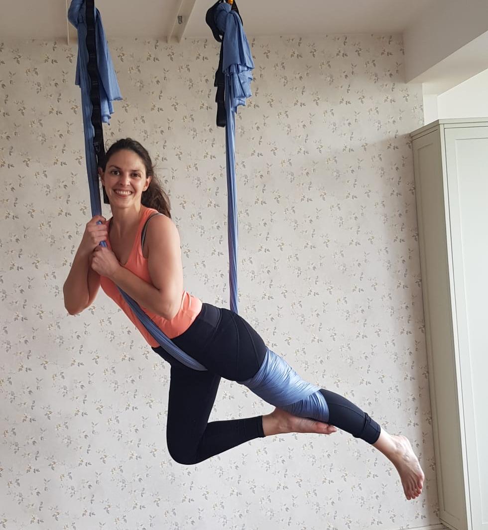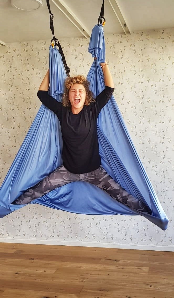 אילנה ויניצקי: "החוויה הכי משמעותית שלי הייתה השיעור הראשון, ועם זאת המשמעות לא דועכת ונוכחת מאז שהתחלתי ועד היום. הופתעתי לגלות את המורכבות שבתרגול יוגה אווירית, איך אפשר לחוות בו זמנית שלווה יחד עם משחקיות, אתגר יחד עם נוחות, והחוויה העוצמתית של להתמודד עם הפחד בעזרת שימת הלב להחזקה של הערסל. בכלל, ההחזקה של הערסל את הגוף מאפשרת חוויה ראשונית ועוצמתית שקשה לתאר במילים. ההיבט האקרובטי מאפשר הנאה, משחקיות ואתגר ופשוט מאפשר לעוף".